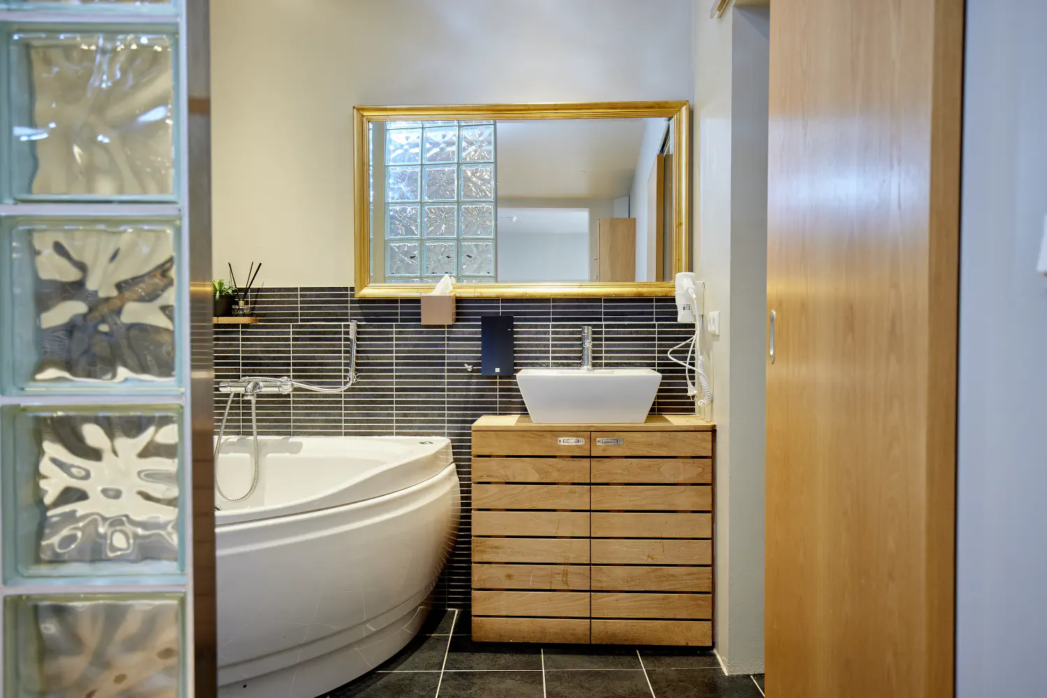 Our luxurious and stylishly furnished suites combine modern facilities with a welcoming atmosphere. Each suite is fitted with parquet flooring, an attractively tiled en-suite bathroom with a bathtub, kitchenette, a direct-dial telephone, a minibar, satellite TV, a safe to store valuables and wireless, free high-speed Internet access, hairdryer.